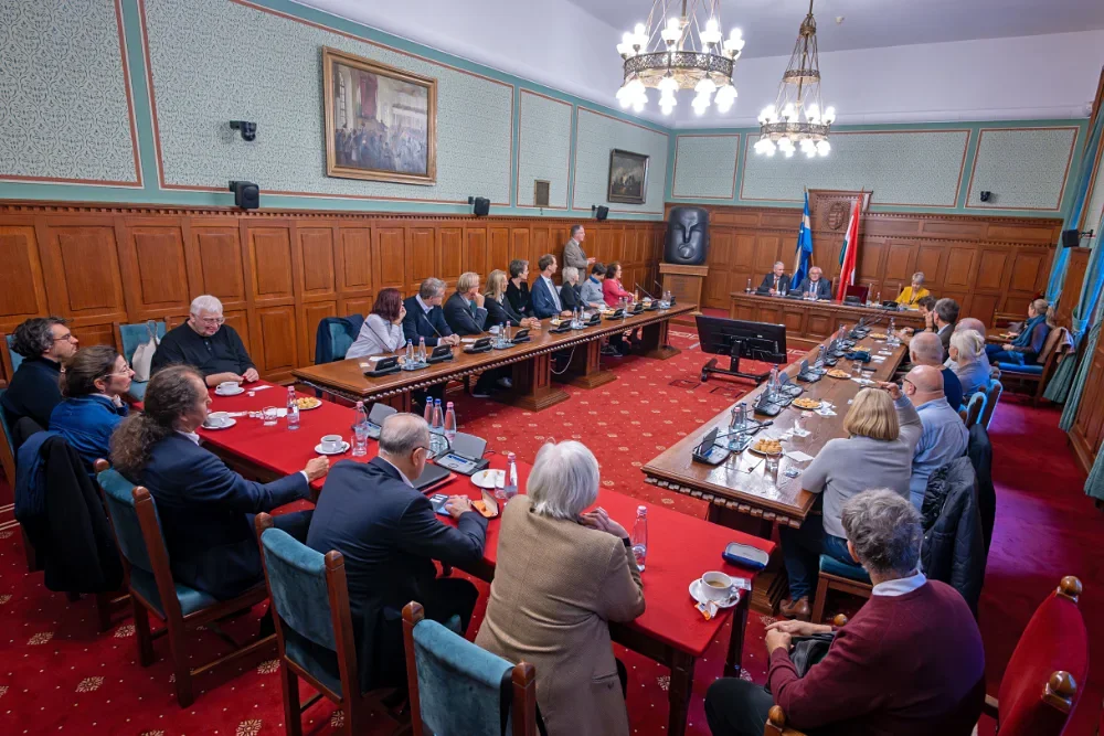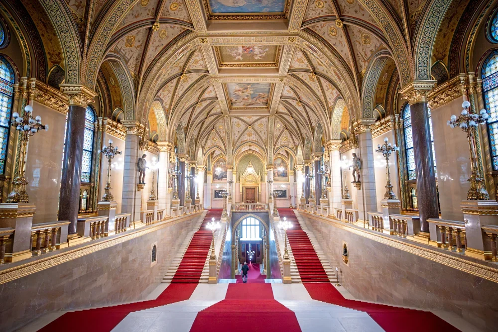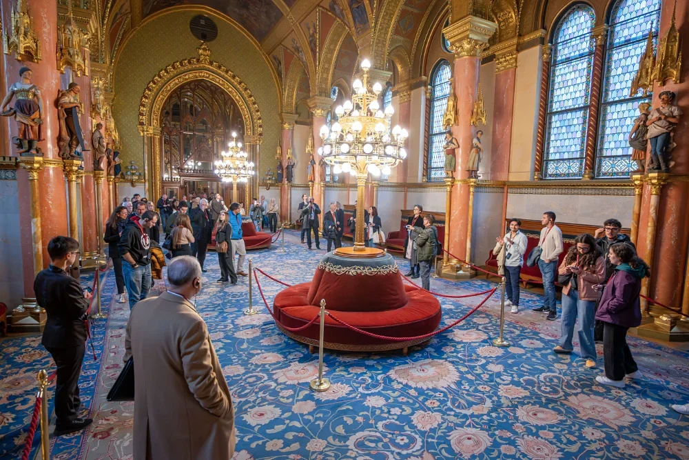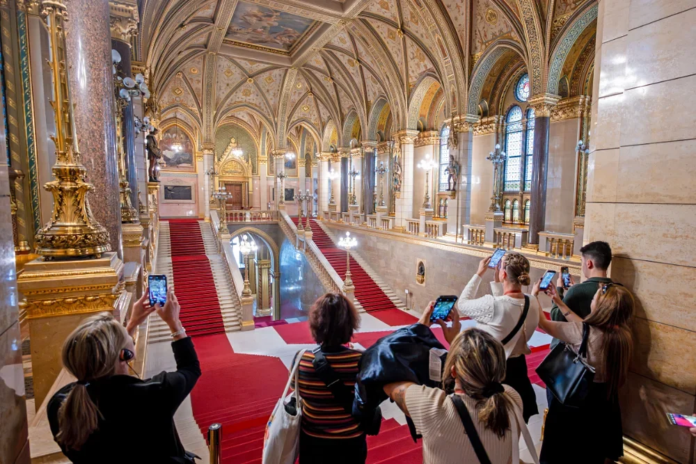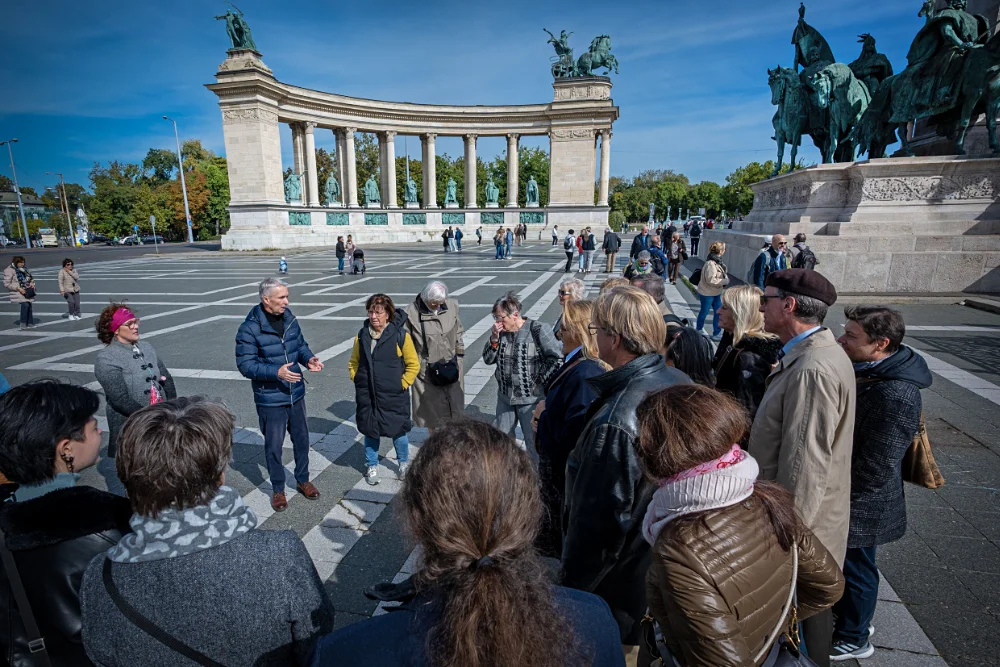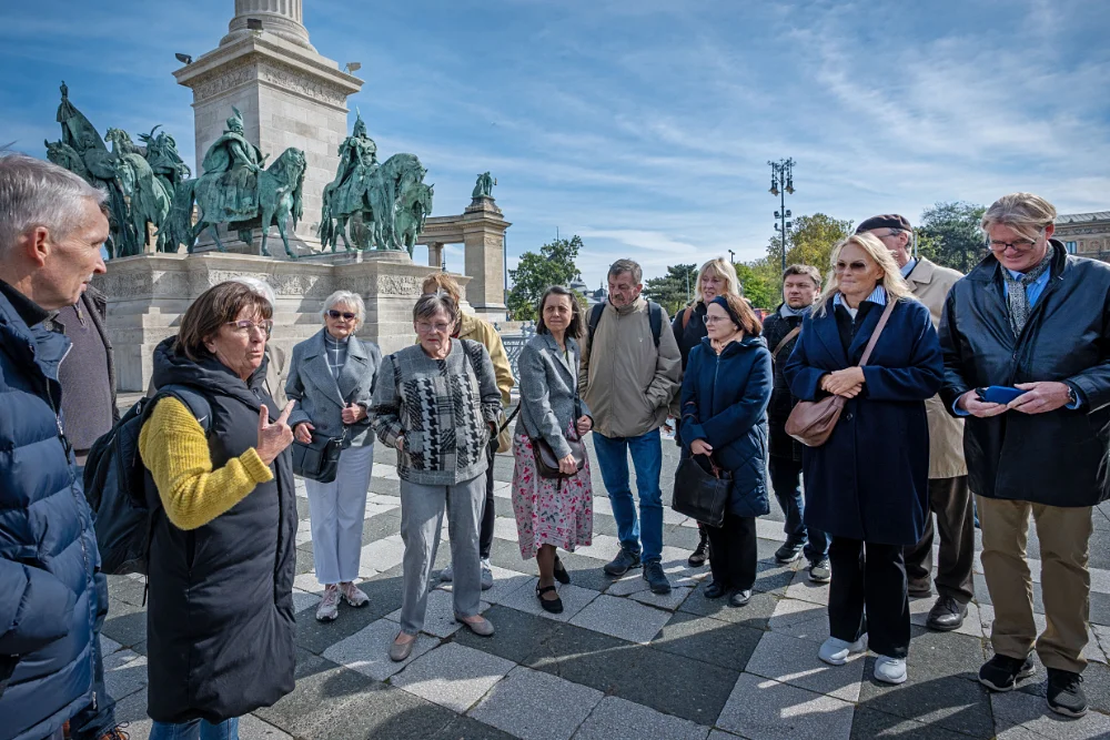 Oktober 2025 | Mehr als 40 Mitglieder der Deutsch-Ungarischen Gesellschaft nahmen unter Führung des DUG-Präsidenten Gerhard Papke Anfang Oktober an einem Besuchsprogramm der DUG in Budapest teil. Unter anderem empfing der Vertreter der Ungarndeutschen und Abgeordnete der Ungarischen Nationalversammlung, Imre Ritter, die Delegation zu einem Gespräch im Parlament. Im Anschluss gab es eine Führung durch das architektonisch nahezu einzigartige Parlamentsgebäude. Abends stand ein Besuch beim Deutsch-Ungarischen Institut für Europäische Zusammenarbeit im Mathias Corvinus Collegium auf dem Programm. Institutsdirektor Bence Bauer begrüßte die Gäste, Mátyás Kohán, Journalist bei der ungarischen Wochenzeitschrift Mandiner, stellte die ungarische Medienlandschaft vor. Tags darauf nahm die bekannte Publizistin Irén Rab die überwiegend aus Deutschland angereisten Besucher am Budapester Heldenplatz mit auf eine besondere kleine Stadtführung durch ausgewählte Wegmarken der ungarischen Geschichte. – Viele Informationen, viele neue Eindrücke, wunderbare Tage in Budapest! Fotos: Thomas F. Starke